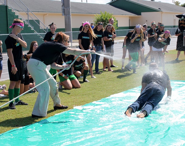 Mrs. Davis was having too much fun at Day Games. Here she aims the water hose at Coach Schenk, who was doing the Slip ‘n’ Slide. (larger)