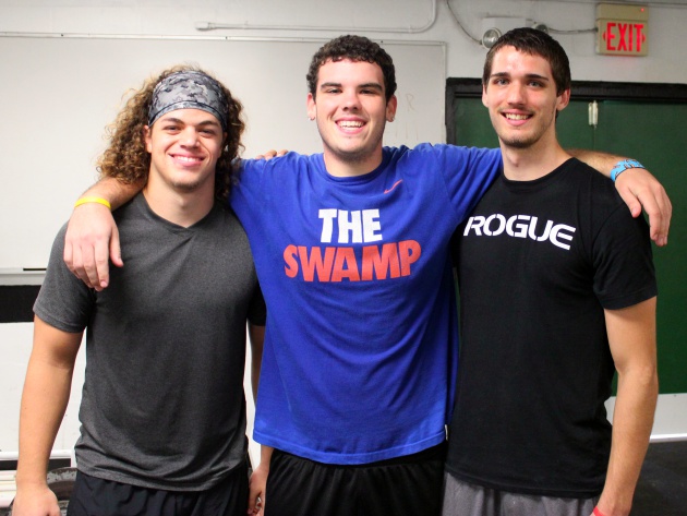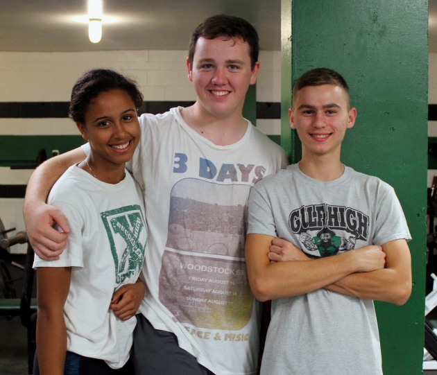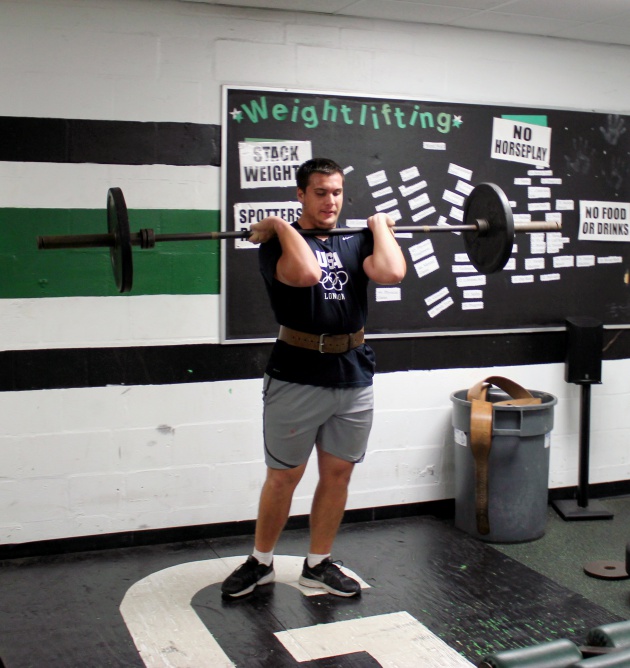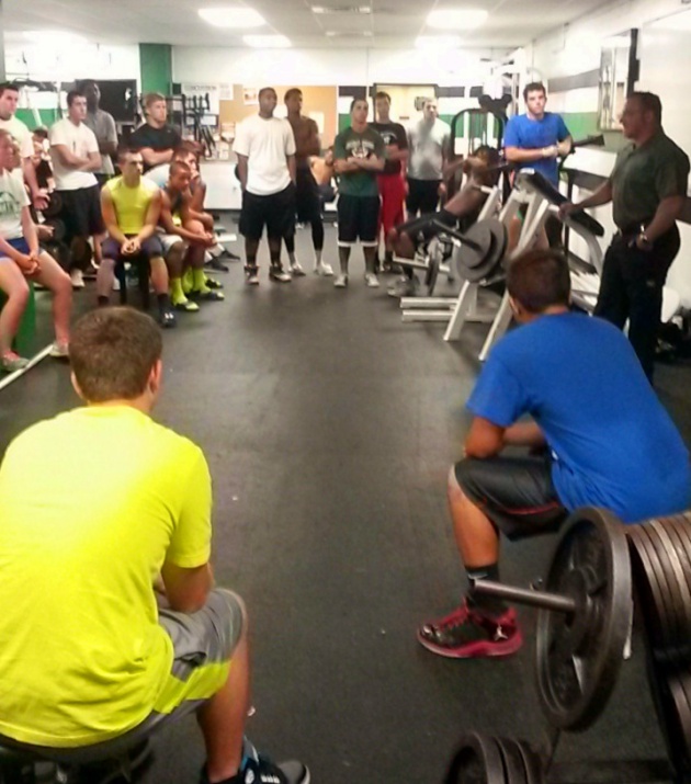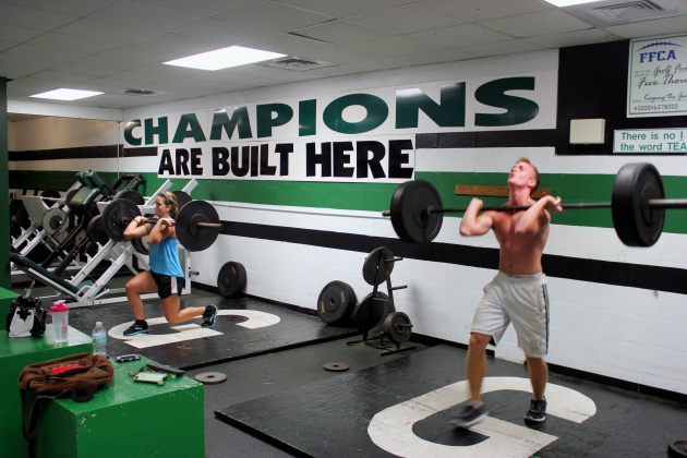 In the first two pictures, 1984 Gulf High graduate and six-time World Champion in the bench press, Mike Farentelli, spoke at our weightlifting camp. Photos provided by Kara Fredrickson. We later took a few more pictures in the weightlifting room today (8/7).