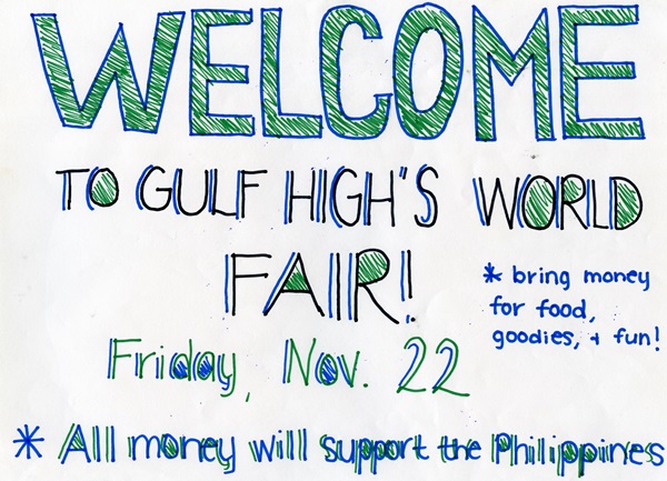 Over 50 booths will be set up represent different countries around the world. Each booth will have an activity that pertains to that country, as well as questions to educate visitors about their country’s geography, history, and culture. Items will be on display and visitors can exchange money for tickets that will be sold next week during both lunches and at the door to purchase food and/or cultural items through out the FAIR. Proceeds made will go towards the victims affected by the Typhoon in the Philippines.