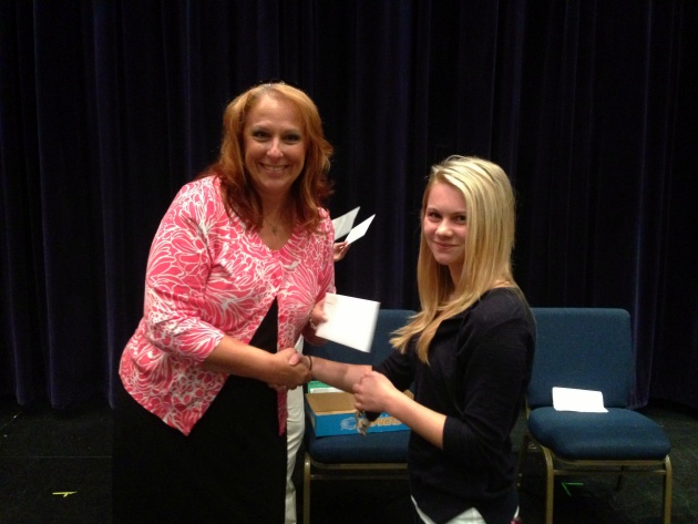 Students completed the second and final day of graduation practice this morning (5/28). In this picture, Mrs. Davis hands a student her graduation tickets. In two days, she will hand the student her diploma.
