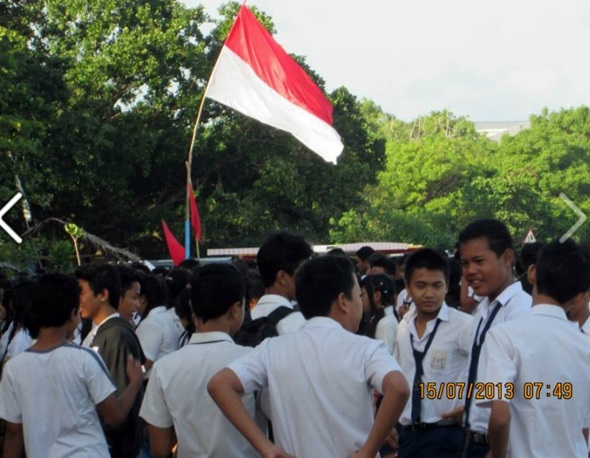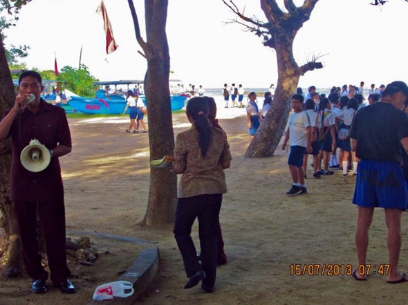 Pictures 1-4 show community service on the shores of Kuta, Bali, Indonesia, as students are cleaning the beach. Picture 3 shows the Principal making morning announcements. In picture 4, students salute the Indonesian flag before doing community service.