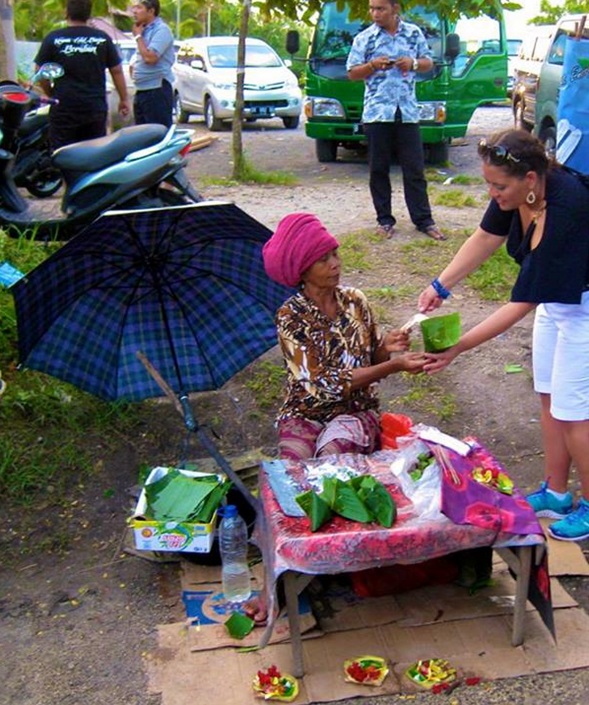 In picture 5 Ms. Dixon is buying pulung-pulung ubi (coconot and cassava) from a woman in a remote village in Bali.