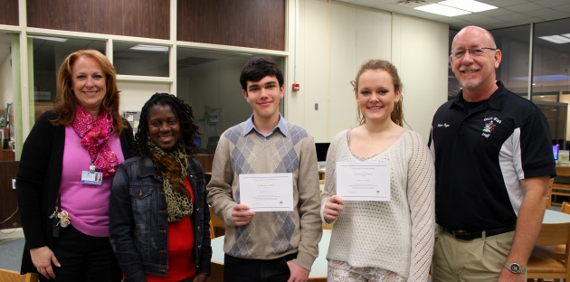 Pictured with the two students are Mrs. Davis; Ms. Burkette, the IB guidance counselor; and Mr. Page.