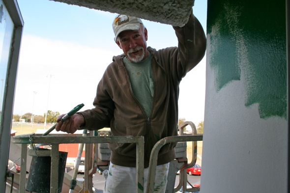 Painting Gulf High School (2) Green stripes are part of the new appearance of Gulf High School. In the bottom photo, district worker Mike Grubb is painting outside a teacher’s window.