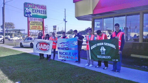 Students were at US 19 and Marine Parkway on March 5 promoting seatbelt use. Pictured: Madison Morlan, Martha Hernandez, Catie Green, Dylan Brown, CJ White, Nico Buonsanto, Will Henson, and Austin Ratliff. A larger picture is here.