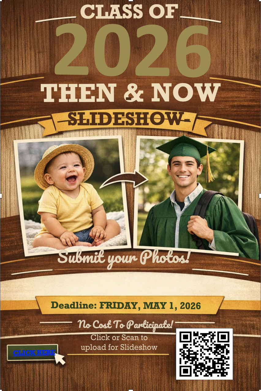 During the Senior Breakfast, we will be showing a “Then and Now Slideshow” comprised of baby and Senior pictures from our students. Photo upload due date is May 1, 2026. Click Here to participate. (Click HERE if you are unable to scan the QR code)