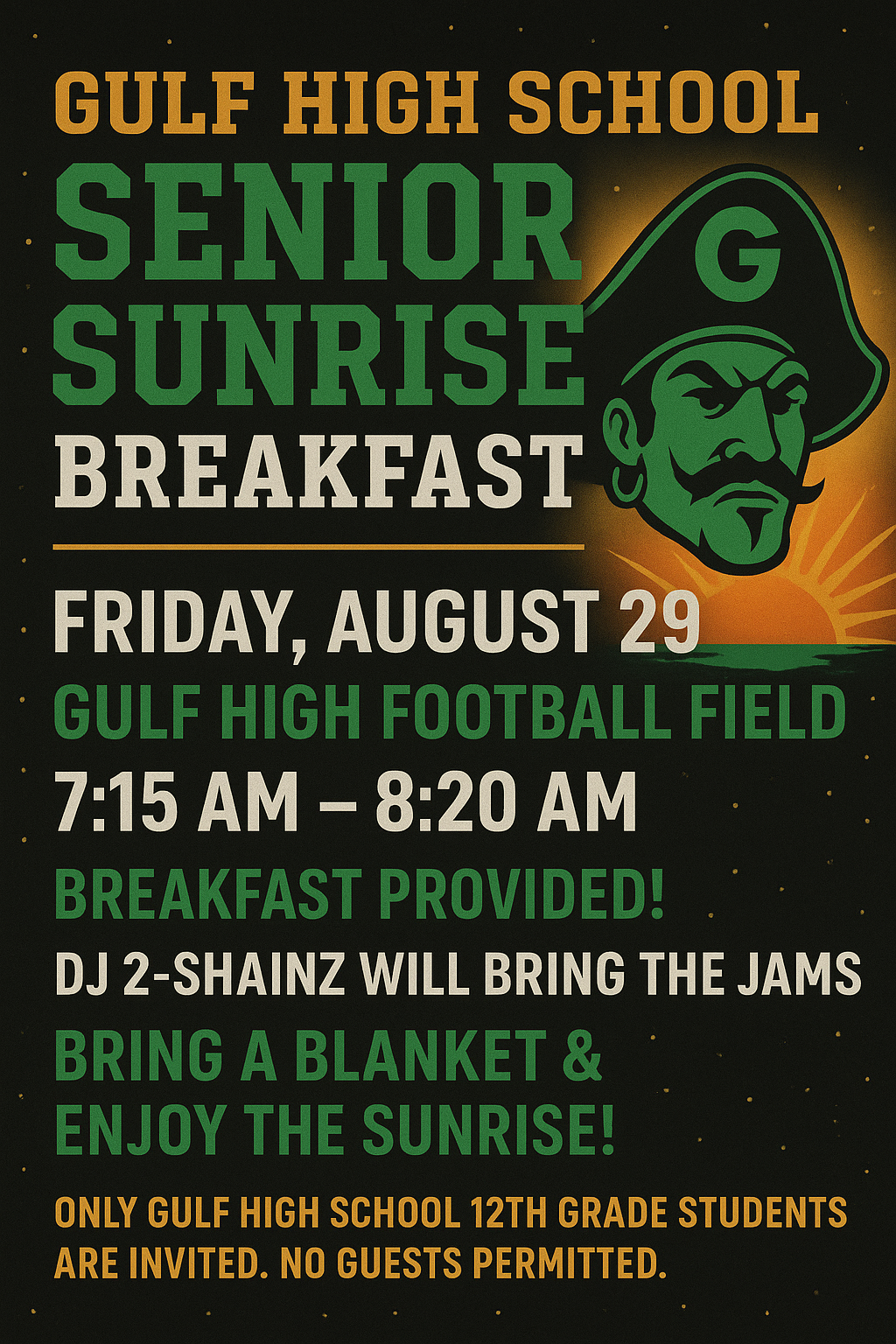 Check out the flyer below for information about our Senior Sunrise Breakfast being held on Friday, August 29th from 7:15am to 8:20am on the football field.