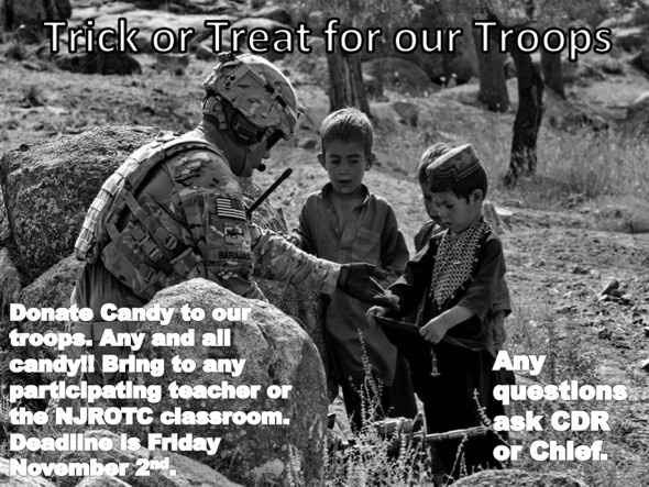 Trick or treat for our troops Gulf NJROTC is collecting candy for our troops. Bring any and all candy to the NJROTC classroom or any participating teacher. Deadline is Nov. 2.