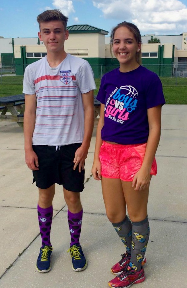 Last week’s Cross Country Athletes of the week were Erik Smith, who broke the 20 minute barrier for his first time at the Land O’ Lakes Invite, and Delanie Crespo, who has an amazing race, cutting almost 3 minutes off of her best time for the 5000 meter race. For their efforts they each receive the coveted “UGLY SOCKS.” They wore them proudly.